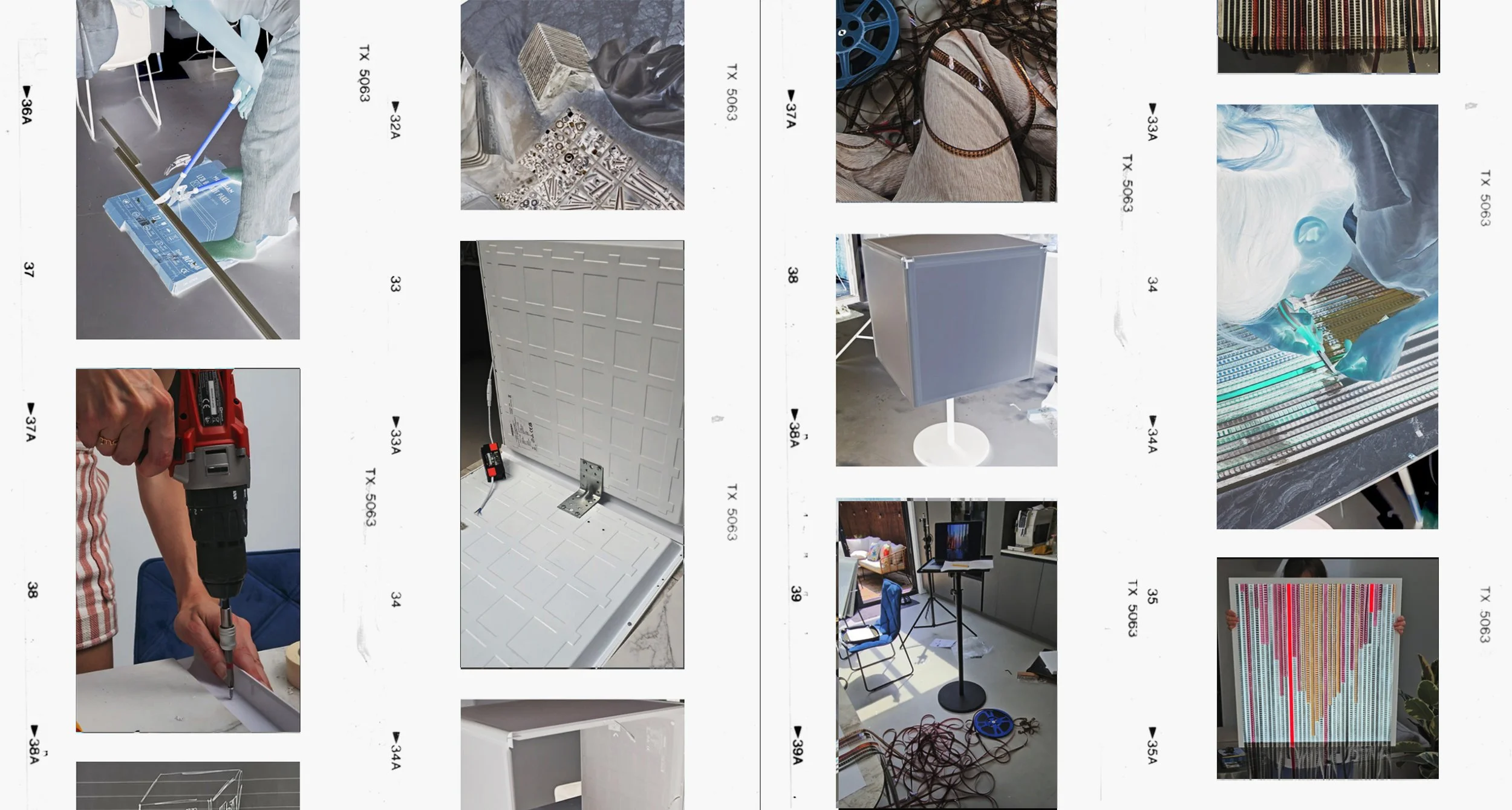 from a distance, strips of 16mm laid side by side read like skyscrapers with tiny windows, repeating a calm, obsessive pattern;
